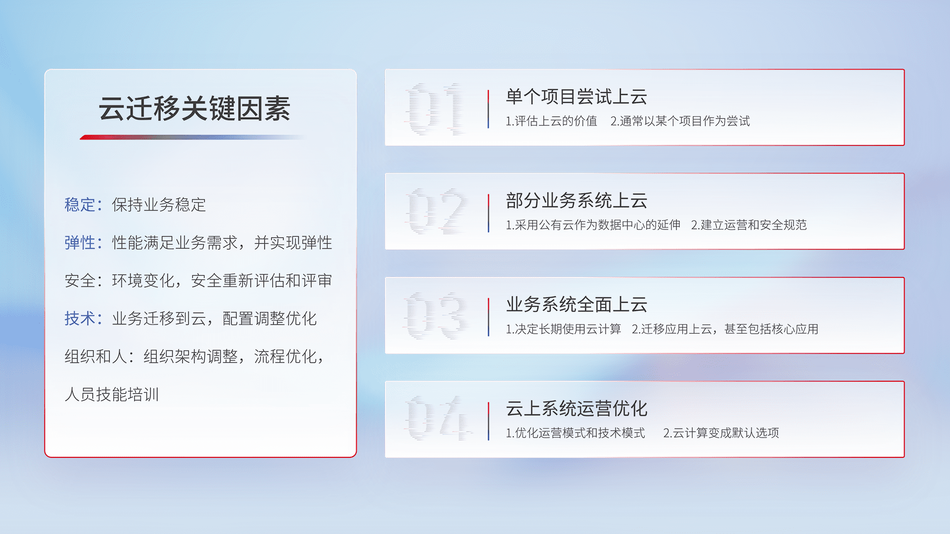 结合实际业务,,从规划设计、、云平台选型、、、、云原生改造、、、数据迁移、、集成交付,,,迁移全过程为客户识别最佳上云路径,,,做好风险识别管理,,,,设计网络架构、、、、身份权限、、、安全审计合规、、、、操作审计、、、日志审计、、监控告警策略、、、、多站点容灾设计等,,,对云上基础设施进行整体规划,,提升IT治理水平,,,,以满足弹性、、、、高可用、、、高性能的需求。。。。