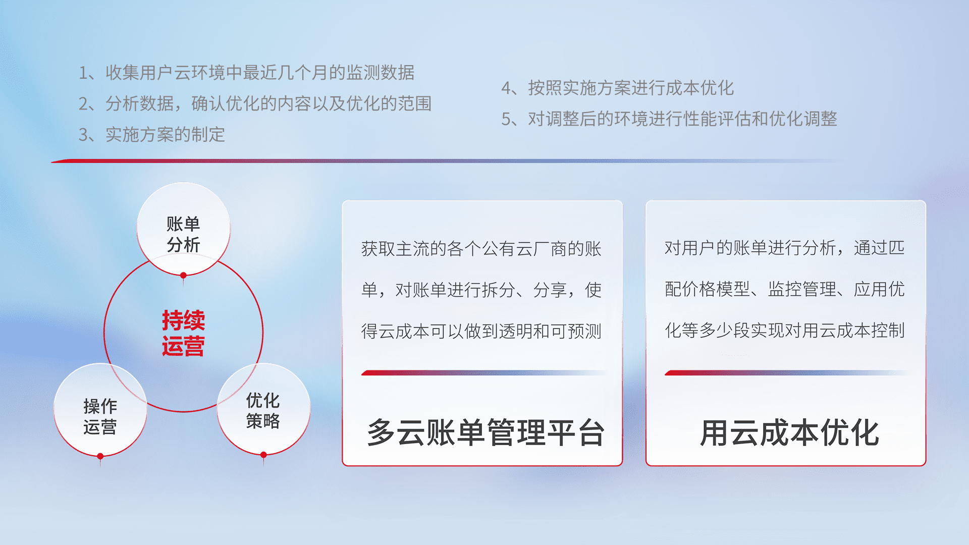 通过多云纳管,,,以统一的资源数据模型把客户的云资源进行抽象和封装,,进而实现对多云资源的统一操作,,,保障云资源管理的可靠性、、、、稳定性与可用性。。量身定制化运维内容,,,配置、、、、开发运维、、、、补丁管理、、、、备份、、、、监控、、、认证和访问管理、、、、审计和日常巡检等,,,,保障在用云过程中的可靠度,,,稳定度以及高可用率。。