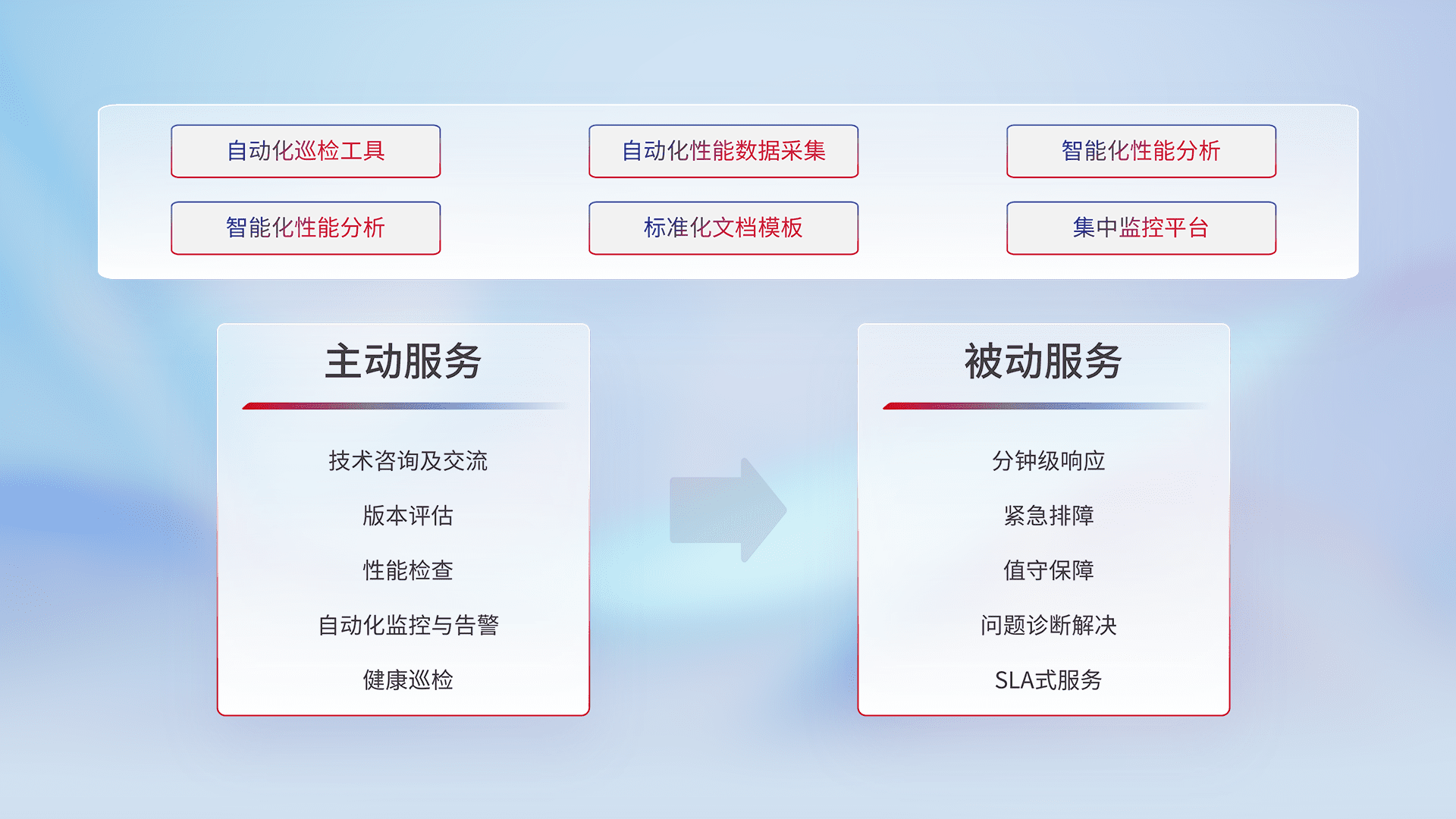 智能化工具和标准化文档,,保障服务质量,,,,提供主动服务(包含技术咨询、、、版本评估、、、性能检查、、、、自动化监控与告警、、、、健康巡检)和被动服务包含(分钟级响应、、、紧急排障、、值守保障、、问题诊断解决、、SLA服务)。。